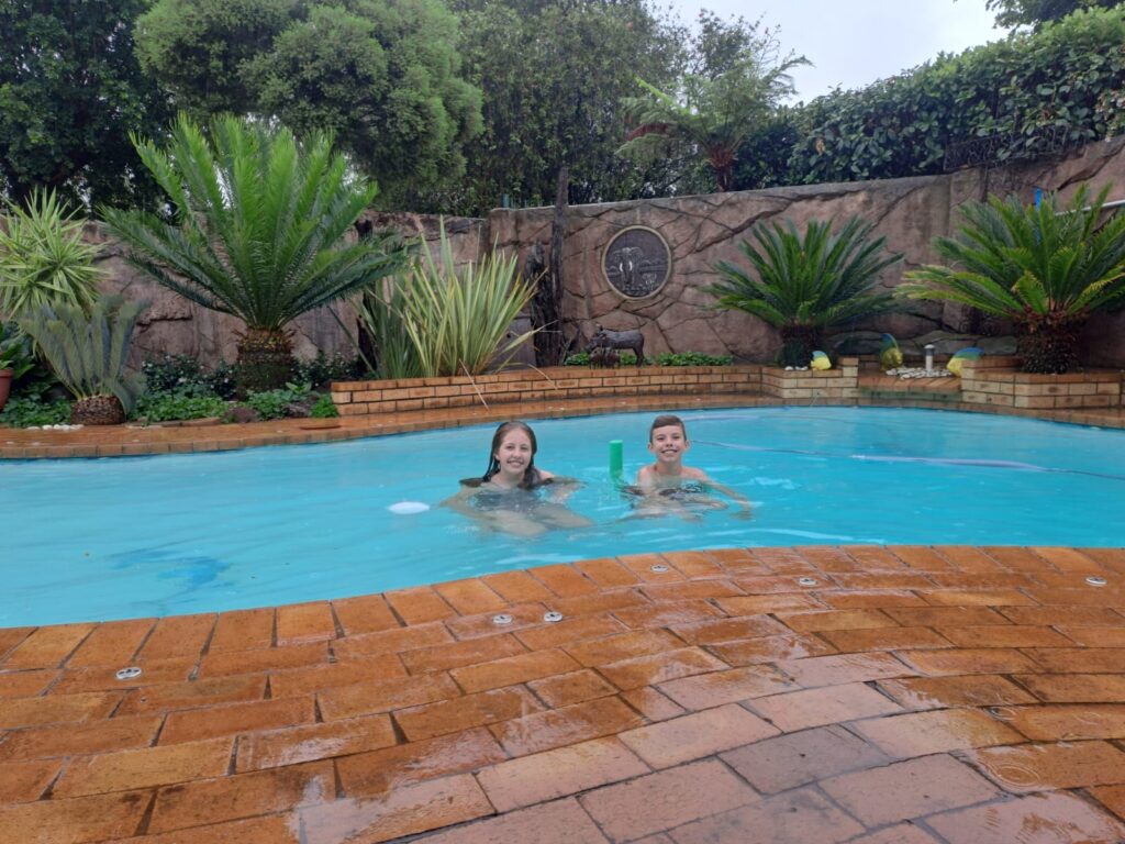 Ons het oorgeslaap by Bonnie en Piet en die 25 ste wakker geword met ‘n lekker reëntjie. Die weerburo voorspel heeldag reën.Daar gaan al ons lekker swem planne.