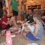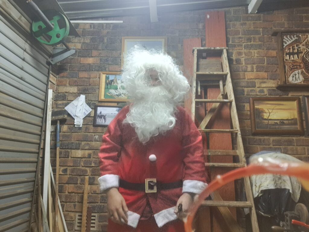 Bonnie, Surika en Mariska sal die week voor die tyd plannetjies beraam oor hoe werk die etery (lees vretery) wie bring wat en wie doen wat. Geskenke word gekoop en iemand is Vader Kersfees. (gewoonlik Timothy) Die probleem is nou die kinders raak groot, en hulle glo mos nie altyd soos hulle groter word meer in Vader Kersfees nie. Miya glo seker nou al so drie of 4 jaar lank nie meer in Vader kersfees nie. (Miskien langer, ek dink persoonlik sy het ons so ‘n jaar of twee voor dit gespeel) Laasjaar was dit nog net Owen wat gedink het Timothy is regtig Vader Kersfees.