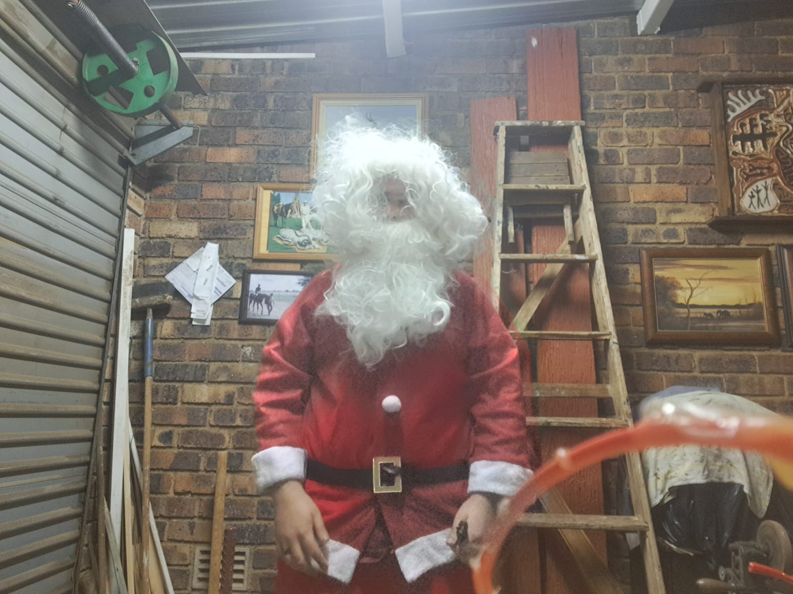 Die jaar het ons besluit Vader Kersfees moet maar net die geskenke by die hek aflaai want hy is skynbaar haastig.