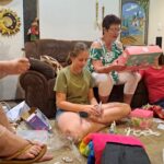 Dan gaan almal binnetoe en geskenke word uitgedeel. Die kinders se opgewondenheid ken natuurlik geen perke nie. So baie nuwe dinge. Miya kry geskenke by ons, Timothy, Oupa en Ouma, en Craig en Mariska. So sy kry ‘n minimum van 4. Die jaar het Miya in skoonheid begin belangstel, sommer oornag. So amper al haar geskenke was nou skoonheids gebaseer. (Ek sien nogal uit na al die behandelings wat Surika en ek hopelik nou gaan kry) Timothy het vir haar ‘n pak met 168 Coki penne gekoop.